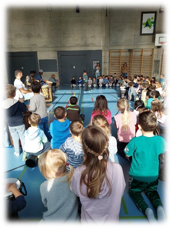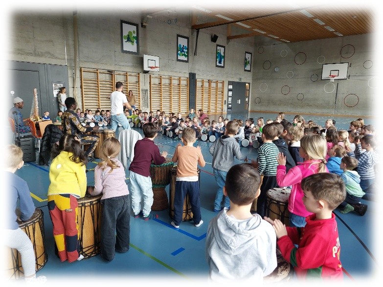 Der diesjährige Kulturanlass stand ganz unter dem Motto «Afrika erleben – Trommeln, Tanzen und Singen». Schon beim Betreten der Turnhalle wurden die Kinder von einladender Trommelmusik empfangen. Nach und nach versammelten sich die Schülerinnen und Schüler der 1.–3. Klassen aus Wäldi, die EK-Kinder sowie die 1. und 2. Klassen aus Tägerwilen und alle Kindergärten der VSG Tägerwilen und lauschten gebannt den mitreissenden Rhythmen.